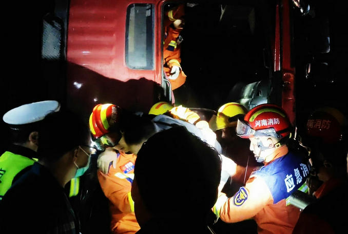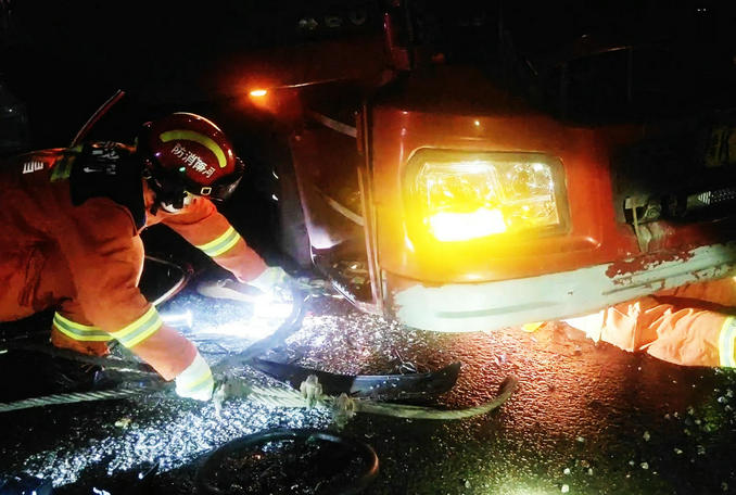 河南禹州:雨夜兩輛貨車追尾一人被困 消防隊(duì)員緊急趕赴破拆救援