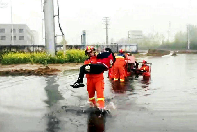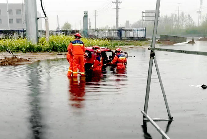 救援人員徒步涉水靠近三輪車,先把被困人員解救出來,然后冒雨把三輪車從水坑中緩慢推出。