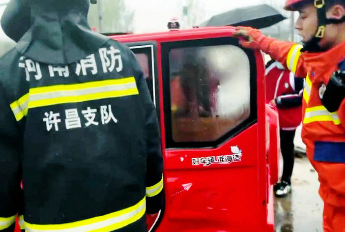 河南禹州:三輪車誤入水坑致兩人被困 消防隊員迅速趕赴現(xiàn)場救援