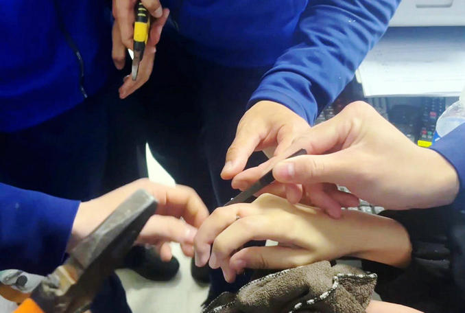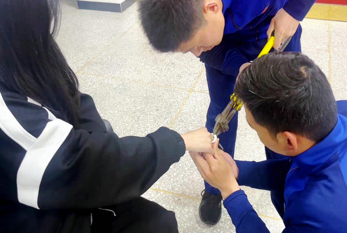 救援人員首先使用剪斷鉗等工具,準(zhǔn)備將金屬扣剪斷,但由于金屬扣較寬,多次嘗試無(wú)果后,改用手持式磨砂輪對(duì)金屬扣進(jìn)行切割。