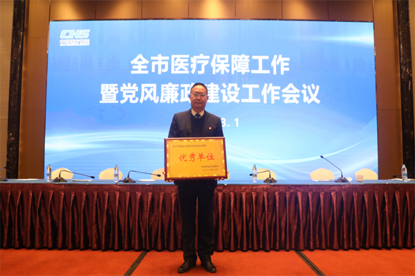 在會議上傳來喜訊,開封市中心醫(yī)院榮獲2021年度定點(diǎn)醫(yī)藥機(jī)構(gòu)綜合考核優(yōu)秀單位,院長李華強(qiáng)上臺領(lǐng)獎。