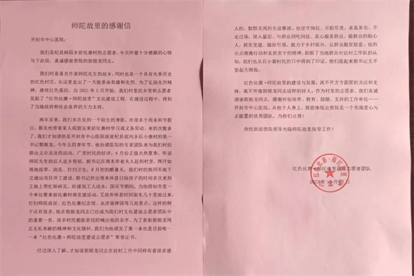 郭銀龍同志的行動感動了淳樸的村民,前不久當?shù)厝罕姙樗蛠硪环飧兄x信,并為他頒發(fā)了第一本也是目前唯一一本“紅色化寨·師陀故里建設志愿者”榮譽證書。志愿者團隊代表親臨我院,真誠感謝郭銀龍同志的無私付出,感謝對他培養(yǎng)、教育、鼓勵、支持的工作單位——開封市中心醫(yī)院。他們說:“從郭書記個人身上,就能感受到貴院是一個充滿愛心與正能量的優(yōu)秀團隊,為你們點贊!”