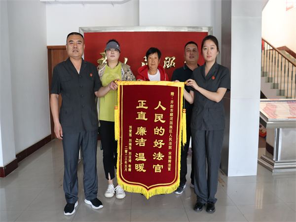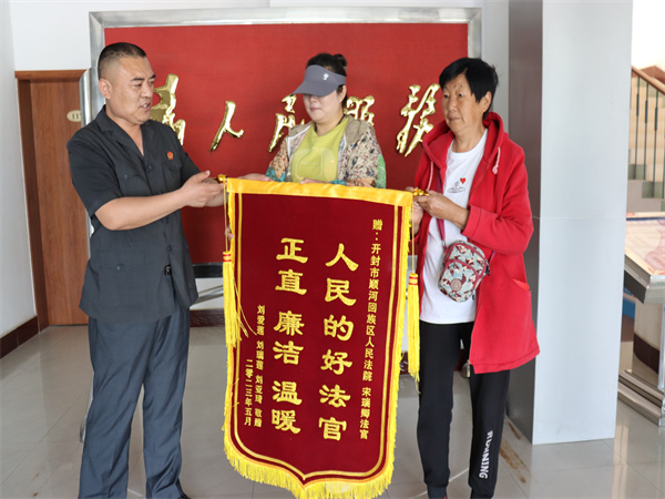 中新河南網(wǎng)5月24日電:5月23日上午,三名當(dāng)事人來(lái)到開封市順河法院,將一面寫有“人民的好法官 正直廉潔溫暖”的錦旗送到順河法院審判管理辦公室主任宋瑞卿的手中,以表對(duì)承辦法官公正司法、溫情調(diào)解的認(rèn)可與感激。
