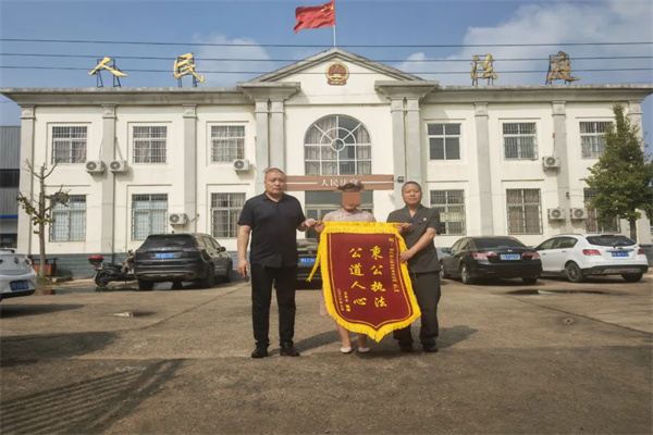 中新河南網(wǎng)9月14日電:9月13日,當事人王女士來到蔡莊法庭將印有“秉公執(zhí)法,公道人心”字樣的錦旗送到開封市尉氏法院蔡莊人民法庭庭長曹磊和調(diào)解員聶廣超手中,并向辦案法官和調(diào)解員再次表達誠摯的謝意。