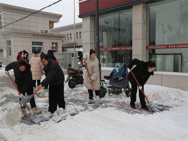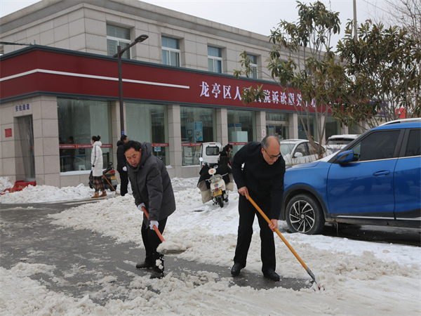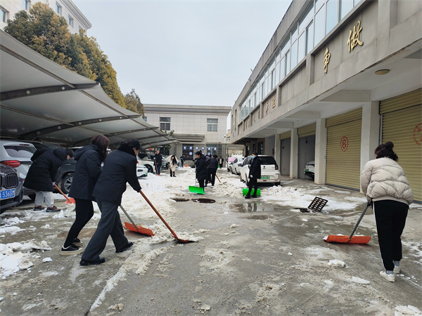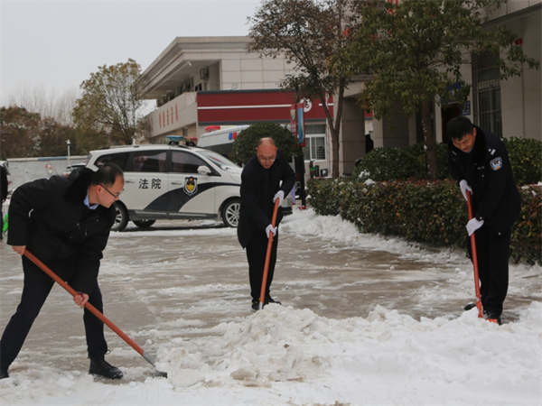 在院領(lǐng)導(dǎo)的帶領(lǐng)下,干警們不畏嚴(yán)寒、默契配合,手持鐵鍬、掃帚,或掃、或鏟、或推,忙得不亦樂乎,忙碌的身影筑成了一道亮麗的風(fēng)景線。經(jīng)過兩個小時的奮戰(zhàn),院內(nèi)外主要出行干道,臺階上的積雪積冰基本清理完畢,干警們用實際行動為來院辦事群眾清掃了一條“平安路”,及時消除了道路結(jié)冰帶來的安全隱患。