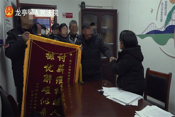 第三天,調(diào)解員李運景在調(diào)解過程中全力以赴保障農(nóng)民工的權(quán)益,贏得了雙方當(dāng)事人的贊賞,農(nóng)民工們集體送來了錦旗表達(dá)感謝。