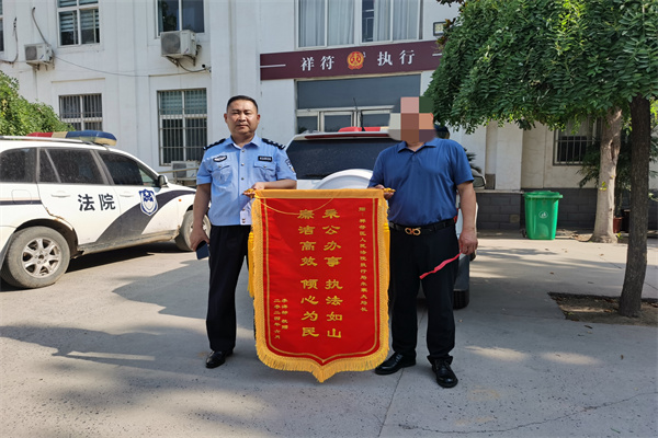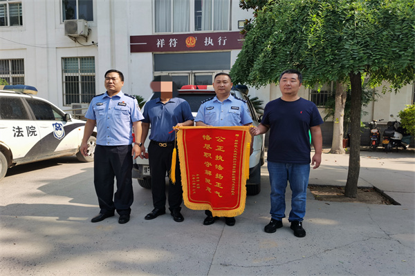 “朱局長,宗法官,我只是打了“執(zhí)行110”的值班電話,沒想到這大熱天你們頂著太陽為了案件奔走,真沒想到你們出警這么快,......實在不知道說啥好,一面錦旗表達(dá)感謝!”