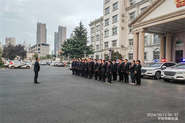 中新河南網(wǎng)10月12日電:2024年10月12日早上6時30分,開封市尉氏縣人民法院辦公樓前執(zhí)行干警列隊整齊,斗志昂揚,審判委員會專職委員鞏春生做動員講話并帶隊執(zhí)行。