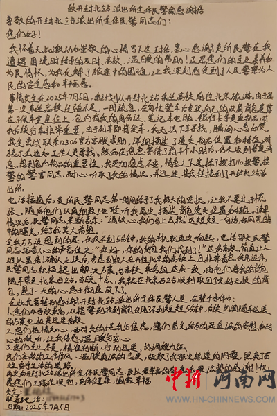中新河南網(wǎng)7月6日電:近日,鄭州鐵路公安處開(kāi)封北站派出所收到旅客董先生寄來(lái)的一封手寫(xiě)感謝信,實(shí)名點(diǎn)贊民警迅速幫其找回遺失的背包。一封書(shū)信,一句感謝,包含了旅客群眾對(duì)公安機(jī)關(guān)的信任,也是對(duì)為民服務(wù)工作最大的認(rèn)可。