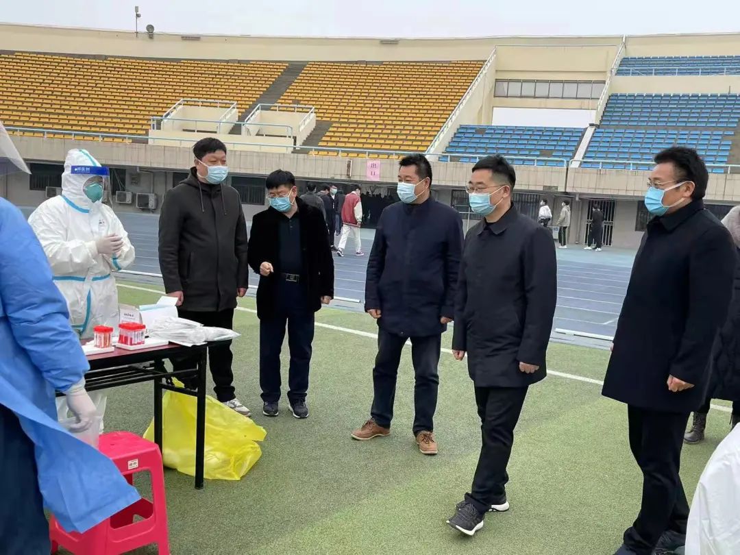 3月21日上午,河南理工大學(xué)第一附屬醫(yī)院、焦作市第二人民醫(yī)院黨委書記楊永國、院長于擁軍、副院長謝向東等領(lǐng)導(dǎo)前往河南理工大學(xué)核酸集中采集點(diǎn)查看運(yùn)行情況。