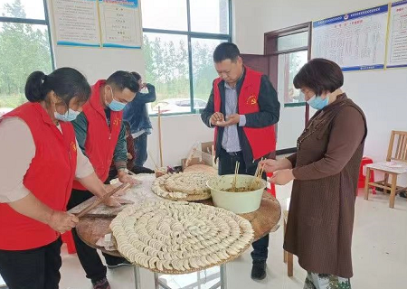 一大早,志愿者和村干部們開始籌備包餃子工作,有的和面、搟皮、包餃子、有的燒水、煮餃子。