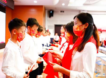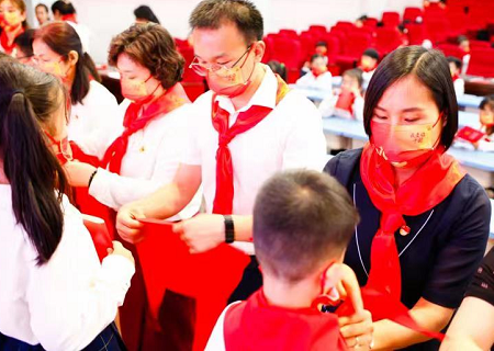 在歡快的歌聲中,黨員、團(tuán)隊(duì)教師代表鄭重地為新隊(duì)員系上了鮮艷的紅領(lǐng)巾,新隊(duì)員們目光堅(jiān)毅,洋溢著自豪的笑容。這是星星火炬交接的時刻,更代表著紅色基因代代相傳!從此,鮮艷的紅領(lǐng)巾飄蕩在胸前,無上的光榮涌動在新隊(duì)員們的心中。