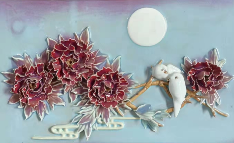 捏塑瓷板畫不僅需要捏塑,還要兩次入火燒制,加之是瓷的質(zhì)地,易發(fā)生變形、窯裂,成功率極低,所以精品很難得。王松濤從研發(fā)以來,炸裂、脫釉、斑點、非藝術(shù)性串色等等,經(jīng)歷了說不清的坎坷與失敗;ò辍⒒ㄈ锶渴鞘帜蟮,上釉也是一筆一筆抹的。一件作品僅上釉一道工序就需要專人工作一天的時間。其中以梅花上釉難度最大,花心一種釉,花邊一種釉,葉面一種釉。以本身就具平整光潔美感的瓷板作為捏塑載體,能顯出畫幅色彩鮮明、靚麗、濃烈的審美意境及獨特高雅的細膩感,上面的構(gòu)圖、線條、色彩等都不會走樣。瓷板遠比紙、絹等具有更穩(wěn)定的物理和化學(xué)性能,不怕潮、霉,不易變質(zhì)。一旦作品完成,色彩經(jīng)久不褪,常年如新。以釉當(dāng)墨將畫或字做在瓷版上終究是平面的展現(xiàn),而鈞瓷捏塑版畫則是一種立體的藝術(shù)表達。受鈞瓷特點的限制,鈞瓷無法像其他瓷區(qū)瓷器一樣在瓷板上畫畫。王松濤把雕塑、捏塑和鈞瓷相結(jié)合,創(chuàng)造出獨特的鈞瓷立體捏塑版畫而獨樹一幟。