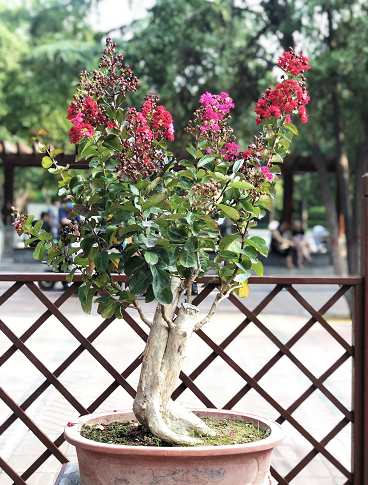 步入公園,10余個(gè)品種、5000余株紫薇在枝頭開得熱烈而奔放,紅的、白的、粉的、紫的......一簇簇,一叢叢,花團(tuán)錦簇,在夏日的微風(fēng)里搖曳生姿,讓人心醉。在公園西門入口處和中心廣場(chǎng),擺放的《年年有魚》、《云想花裳》兩組立體花壇奪人眼球,紫薇樁景錯(cuò)落有致地排列,紫薇樹干屈曲、枝葉繁茂、繁花朵朵,搭配各色時(shí)令花卉,組成公園優(yōu)美一隅;在紫薇大道,沿著游路擺放的80余盆花瓶造型紫薇和樹狀紫薇,造型優(yōu)雅、花朵嬌艷,花瓣隨風(fēng)搖曳,如詩如畫;最引入注目的紫薇盆景展區(qū),50余盆紫薇盆景及松柏類盆景,其造型或虬曲蒼勁、或蜿蜒盤旋、或古樸自然,耐人尋味。