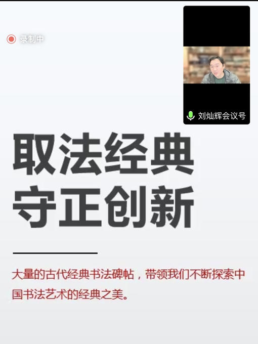 河南省書法家協(xié)會副主席、洛陽市書法家協(xié)會主席劉燦輝通過線上,向大家做了題為《書法選帖臨帖與創(chuàng)作入門》的專題報告,他通過引經據(jù)典,深入淺出地告誡師生們要“取法經典,守正創(chuàng)新”。
