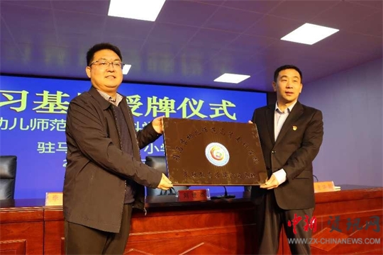 最后,駐馬店幼兒師范高等專科學(xué)校校長(zhǎng)李柯頒授見習(xí)基地匾牌,第十小學(xué)王華起校長(zhǎng)接牌。